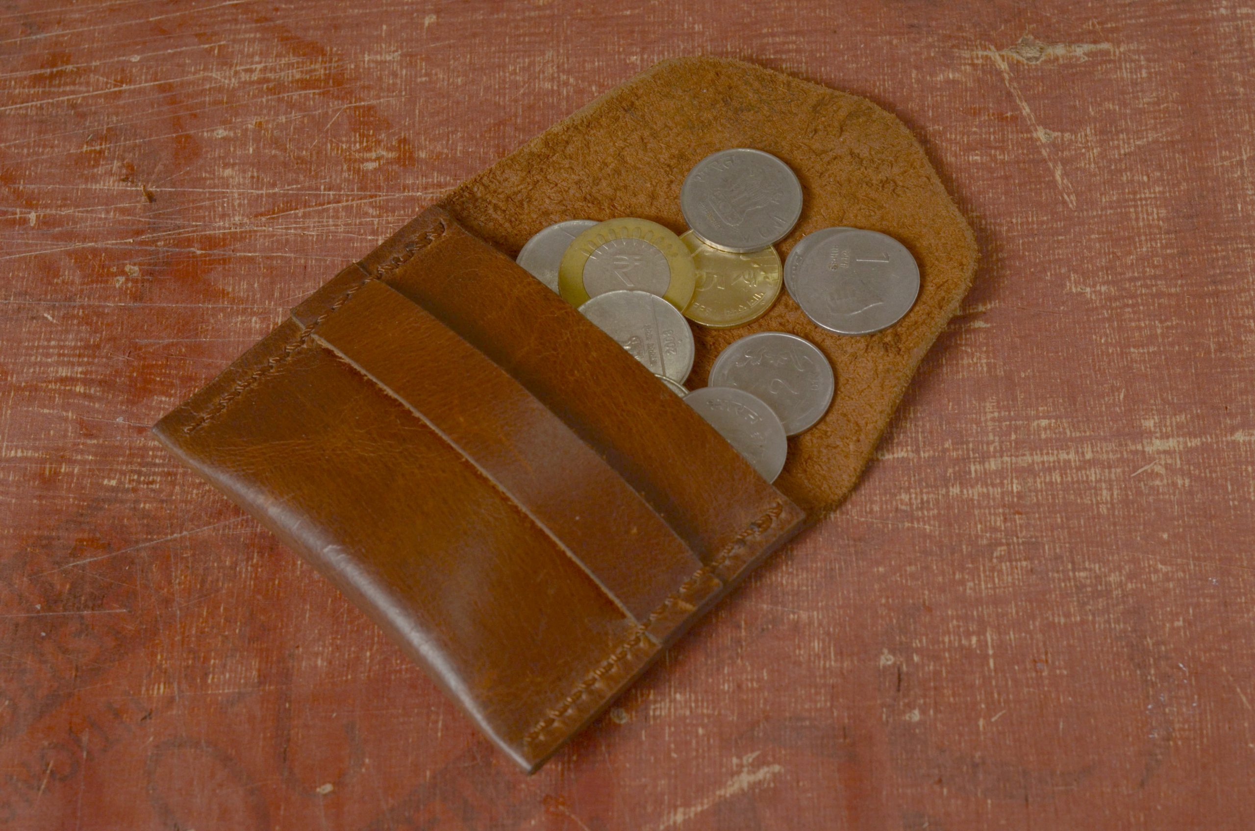 A simple coin purse. Holds coins and folded bills.Hand punched & sewn with burnished & waxed edges.Natural vegetable tanned leather.Handmade in India.